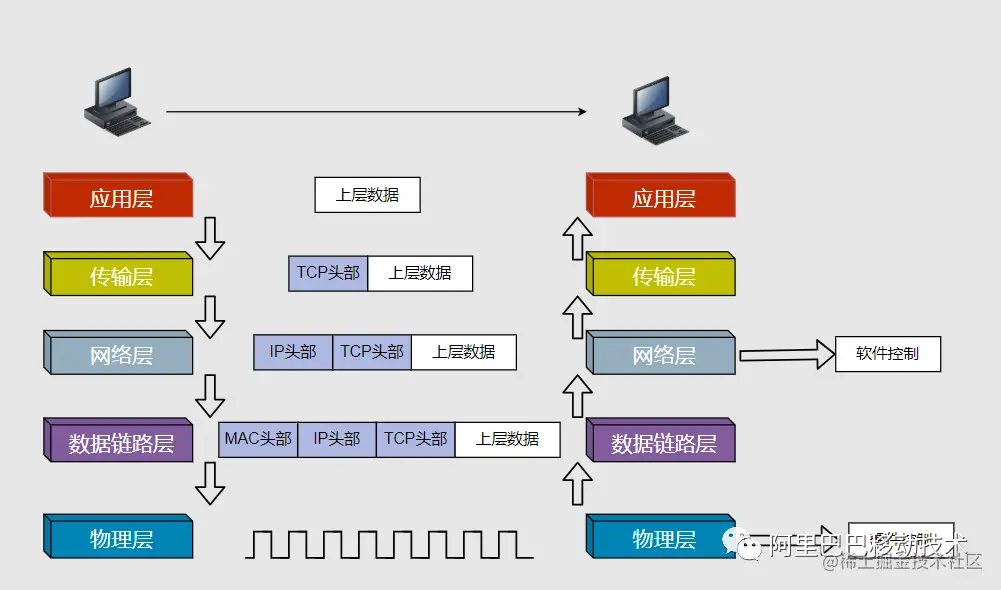 由下图TCP/IP协议传输过程,弱网控制主要有两种场景:硬件控制和软件控制。