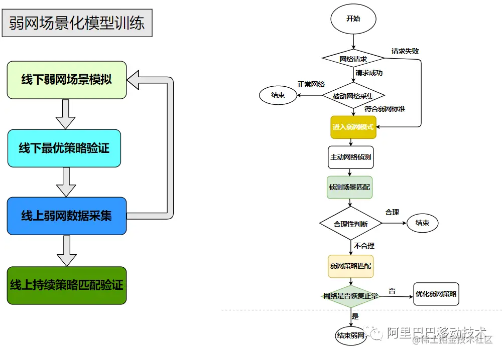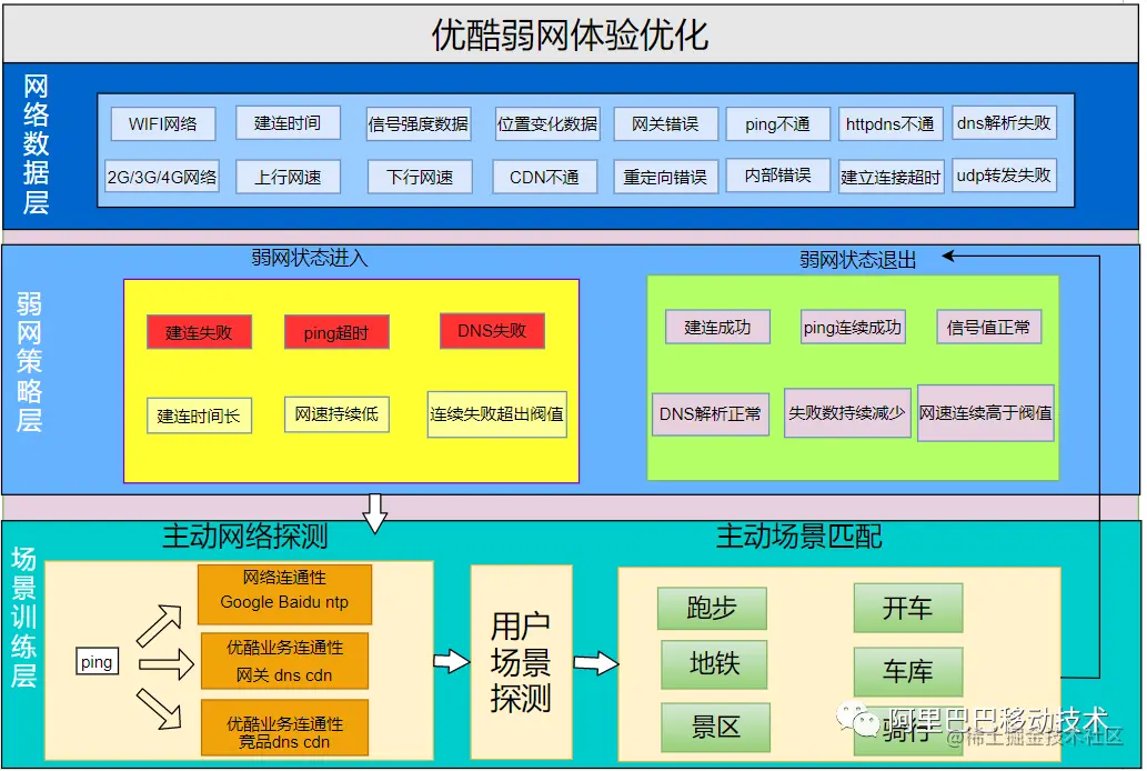优酷业务主要是音视频播放,对网络稳定性的要求非常高,因此在弱网优化这一块,也积累的一些经验,主要从网络数据采集出发,针对用户实际的网络状况进行采集。在弱网策略层,对采集到的网络数据进行弱网状态的进入及退出进行策略判断,当用户进行弱网状态时,通过线下数据的策略匹配,对线上用户实际的场景进行匹配,最终达到网路优化的效果,具体可参考如下图: