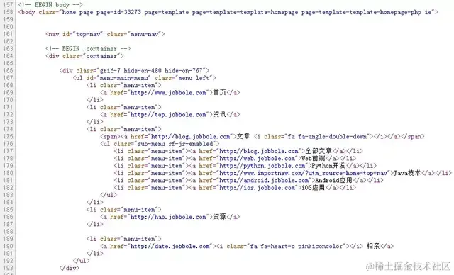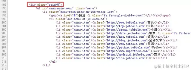 如上图中的红色框框中,class为属性,而等于号后边的“grid-5”即为属性值,有的时候节点内不只是一个属性,如上图中的196行中,就有两个属性。