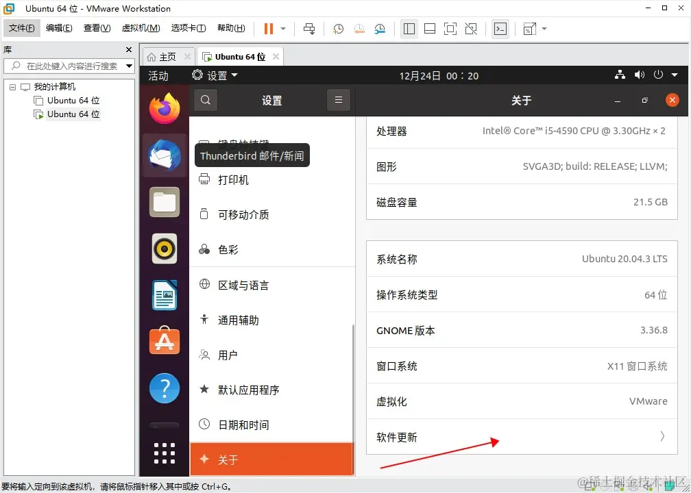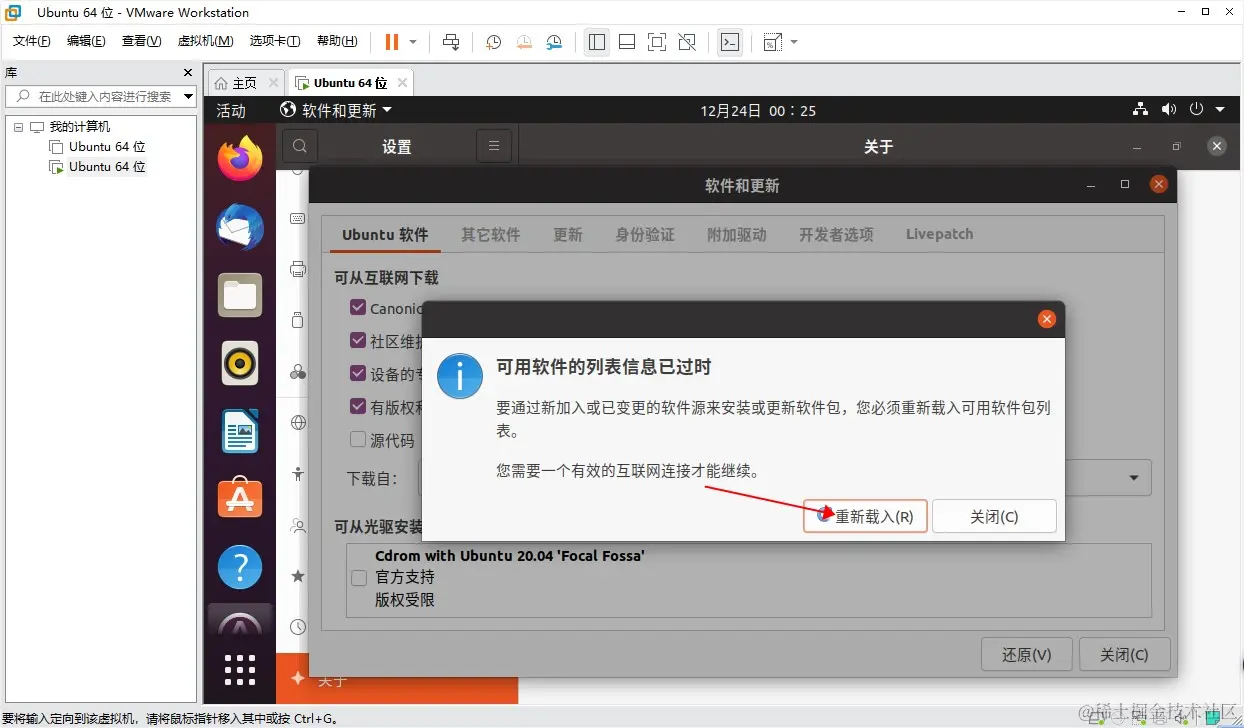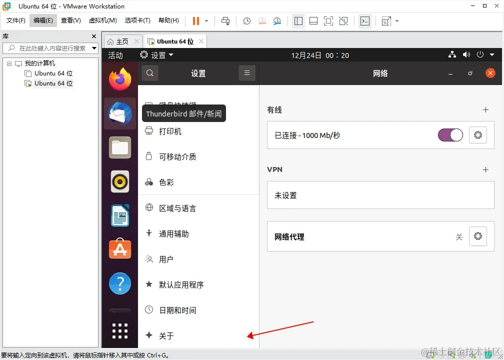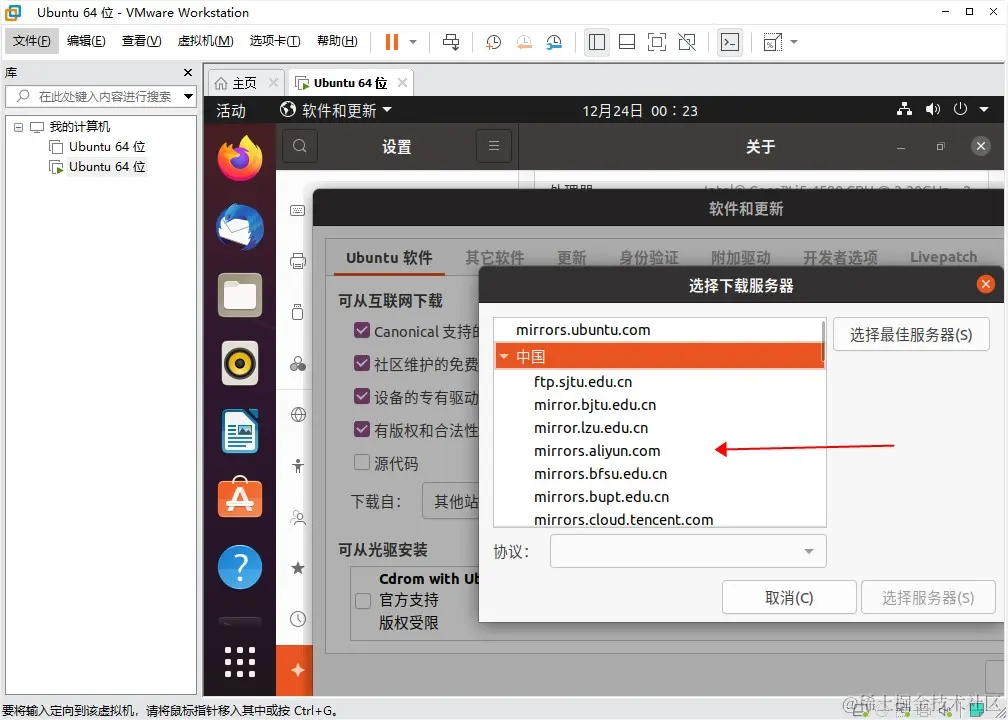 vmware虚拟机下的Ubuntu20切换国内阿里镜像源 用户4574405598413 2021-12-24 166 阅读1分钟 参考 阿里巴巴开源镜像站 图形界面操作 - 适用于桌面版Ubuntu20 首选进入桌面版的设置界面 如图 下拉 点击 关于 右边 点击 软件更新 选择服务器 ,点其他站点 使用阿里源mirrors.aliyun.com/ubuntu/ 设置后选择关闭,然后重新载入即可