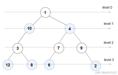 输入:root = [1,10,4,3,null,7,9,12,8,6,null,null,2]