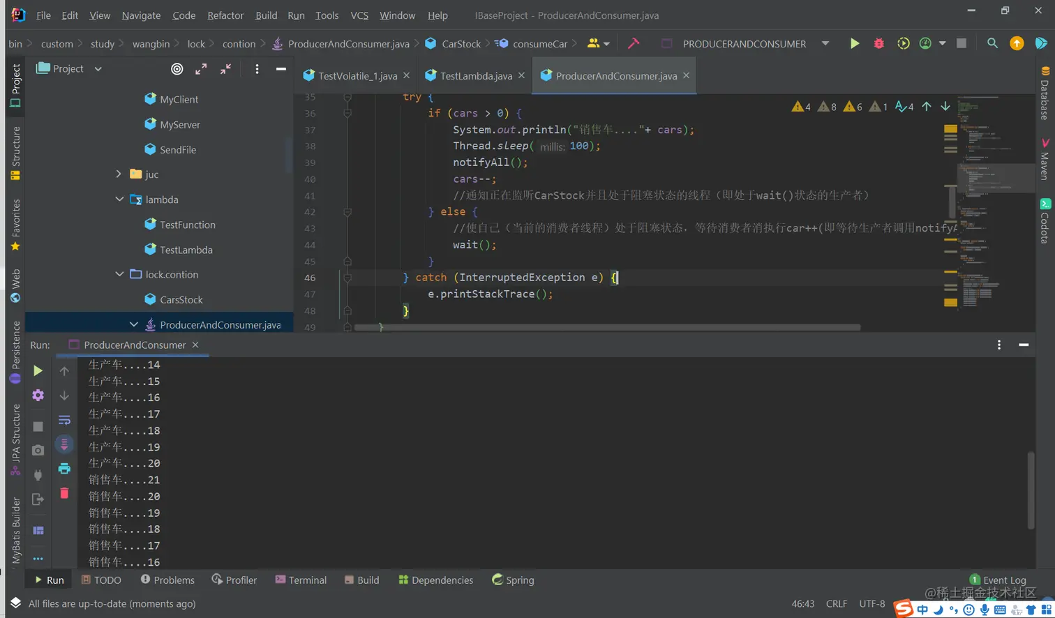 wait()使自己处于阻塞状态;直到消费者消费了一些产量(<20),再通过notify()或notifyAll()唤醒生产者去继续生产。 - 当产量为0时,消费者会调用