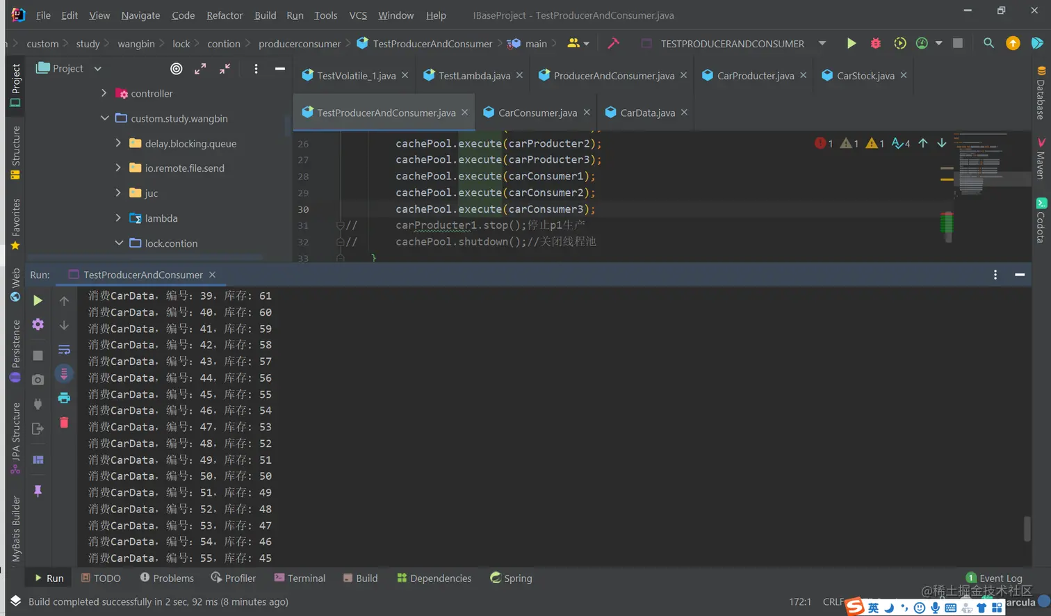 接下来,我们使用队列和线程池技术对该程序进行改进,并且此次共享数据是一个BlockingQueue队列,该队列可以保存100个Car Data对象。