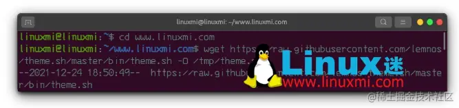 linuxmi@linuxmi:~/www.linuxmi.com$ wget https://raw.githubusercontent.com/lemnos/theme.sh/master/bin/theme.sh -O /tmp/theme.sh