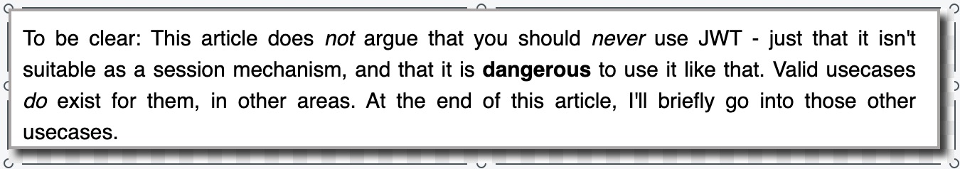 在任何情况下,在这篇博客中,我将只关注使用JWT的潜在风险,并谈论一个已经过了10年的经过数次战斗的解决方案。