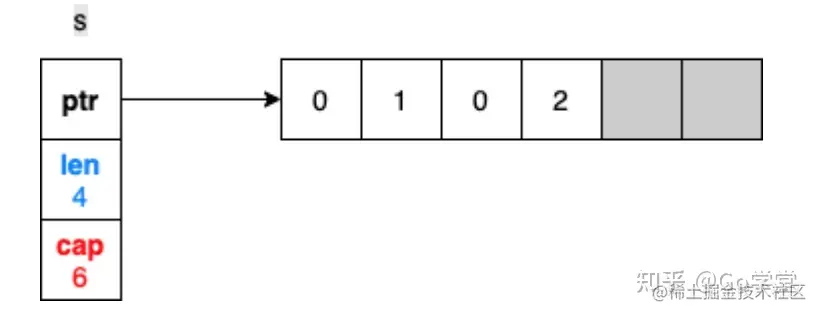 但是,不允许访问切片长度(length)以外的元素,即使长度以外的内存空间也已经被分配了。例如,s[4] = 0 会引发panic:
