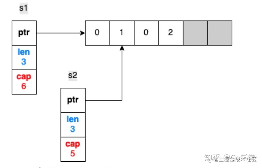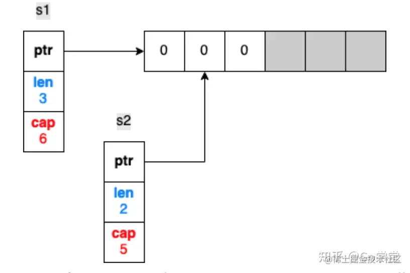 首先,s1被初始化成一个长度为3,容量为6的切片。当通过切分s1创建s2切片时,s1和s2的指针字段都指向同一个后端数组。但是,s2的第一个元素的索引是从数组的索引1开始的。因此,切片s2的长度和容量是和s1不同的:长度为2,容量为5.