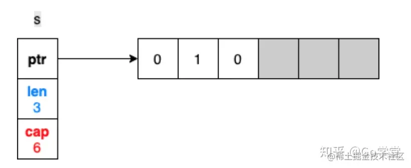该切片创建了一个能够容纳6个元素(容量)的数组。同时,因为长度length被设置成了3,所以,Go仅仅初始化前3个元素。因为slice的元素是[]int类型,所以前3个元素用int的零值0来初始化。剩余的元素空间只被分配,但没有使用。