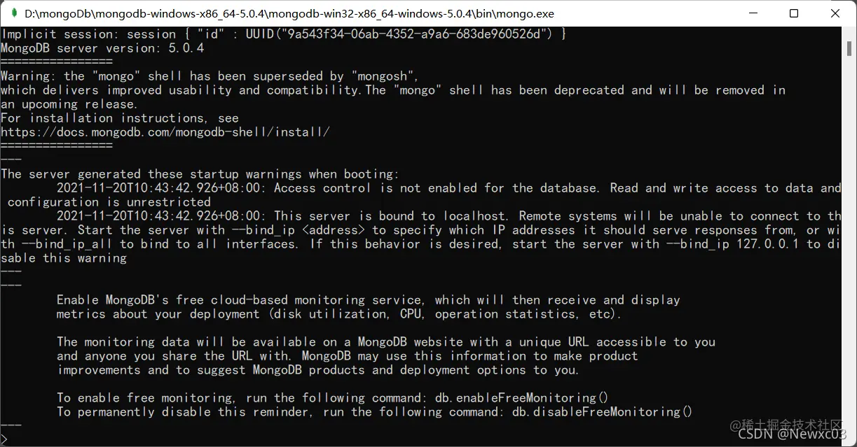 然后保持mongod.exe窗口运行 再点击打开mongo.exe 弹出以下内容则代表成功