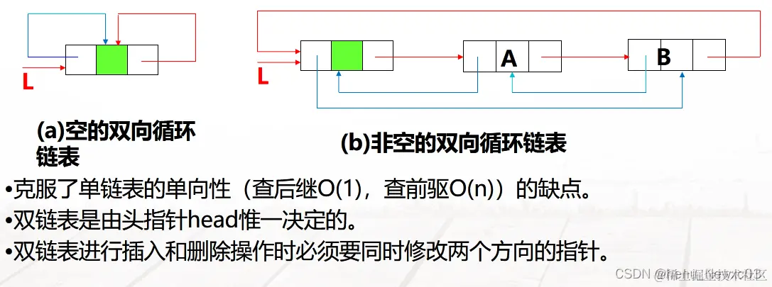 **双向链表:**结点有两个指针域,一个指向直接前驱,一个指向直接后继。