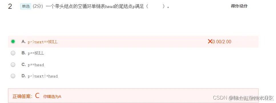 Status GetElem_L(LinkList L, int i, ElemType &e){ // 注意:L为带头结点的单链表的头指针 // 当第i个元素存在时,其值赋给e并返回OK,否则返回ERROR P=L->next; j=1;//j用来计数 while(p && j<i) {p=p->next; ++j;} if (!p || j>i) return ERROR; //!p即p为空,有两种情况,第一种是表为空;第二种是i的值超过了表的长度,while循环执行完后p走到最后一个元素还没有找到i的位置。j >i 就是i是0或者负数的情况。 e=p->data; return OK; } -