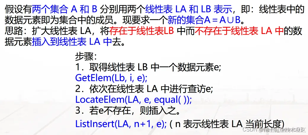 //伪代码 void union(List &La, List Lb) { La_len = ListLength(La); // 求线性表La的长度 Lb_len = ListLength(Lb); // 求线性表Lb的长度 for(i=1;i<=Lb_len; i++) { GetElem(Lb, i, e); // 取Lb中第i个数据元素赋给e if (!LocateElem ( La, e, equal( )) ) ListInsert(La, ++La_len, e); // La中不存在和 e 相同的数据元素,则插入之 }//for } // union