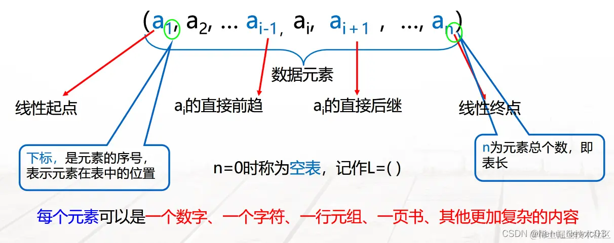 - **定义:**若结构是非空有限集,则有且仅有一个开始结点和一个终端结点,并且所有结点都最多只有一个直接前趋和一个直接后继。