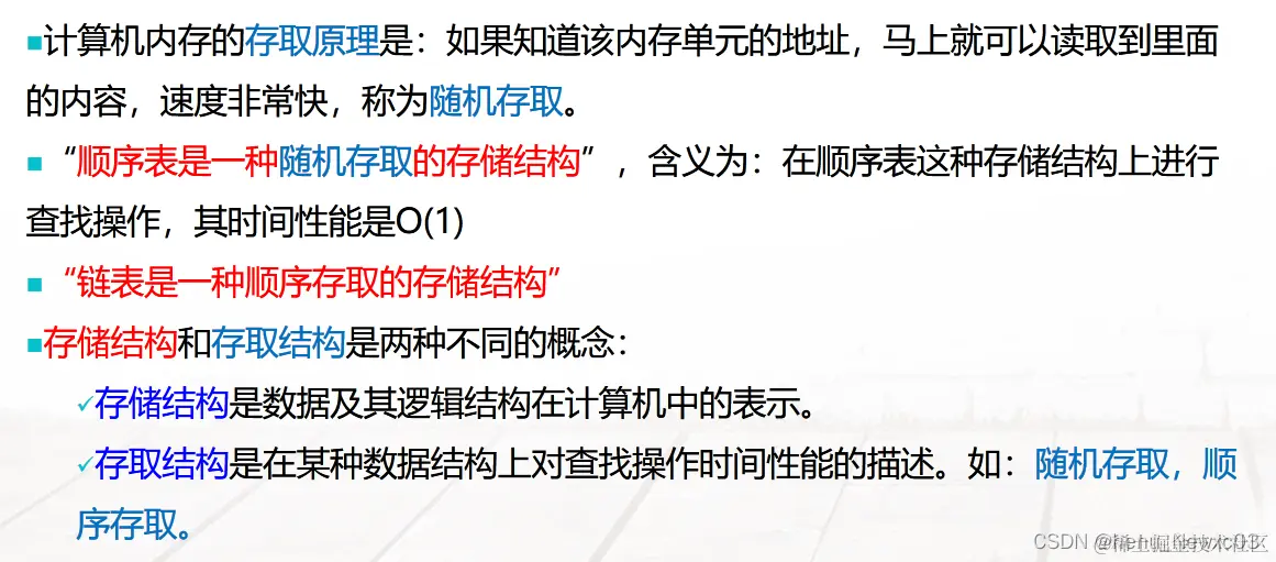 随机存取结构。对表中任一结点都可在O(1)时间内直接取得。若线性表的操作主要是进行查找,很少做插入和删除操作,则采用顺序表作为存储结构为宜。