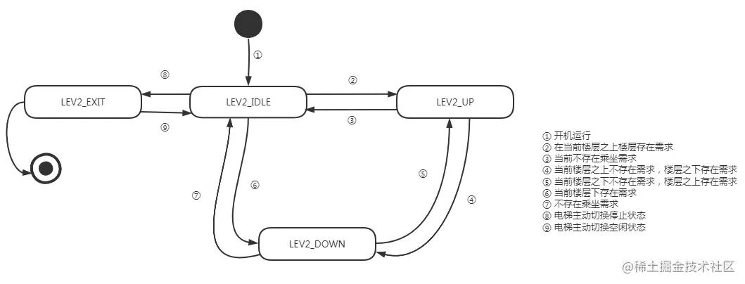 最后整理出不同状态下遇到这些需求的处理方式以及电梯状态的切换条件,就能够构建出所有场景。