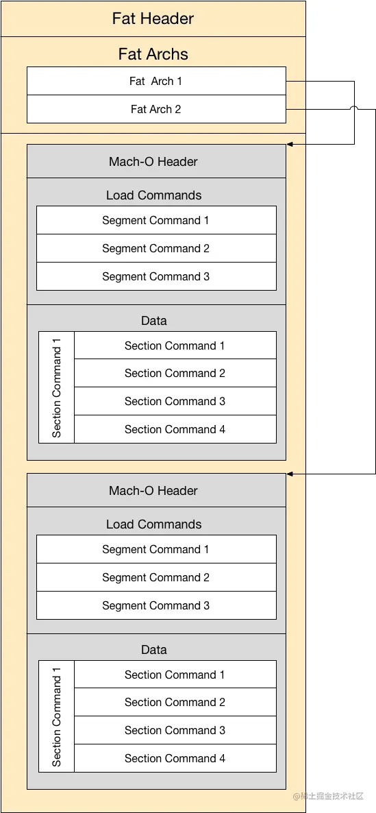 Universal Binary格式文件(通用二进制,也称胖二进制),实际上只是将不同架构的的 Mach-O 文件打包到一起,再在文件起始位置处加上 fat_header 结构来说明所支持的架构和偏移地址信息,其结构如下图所示: