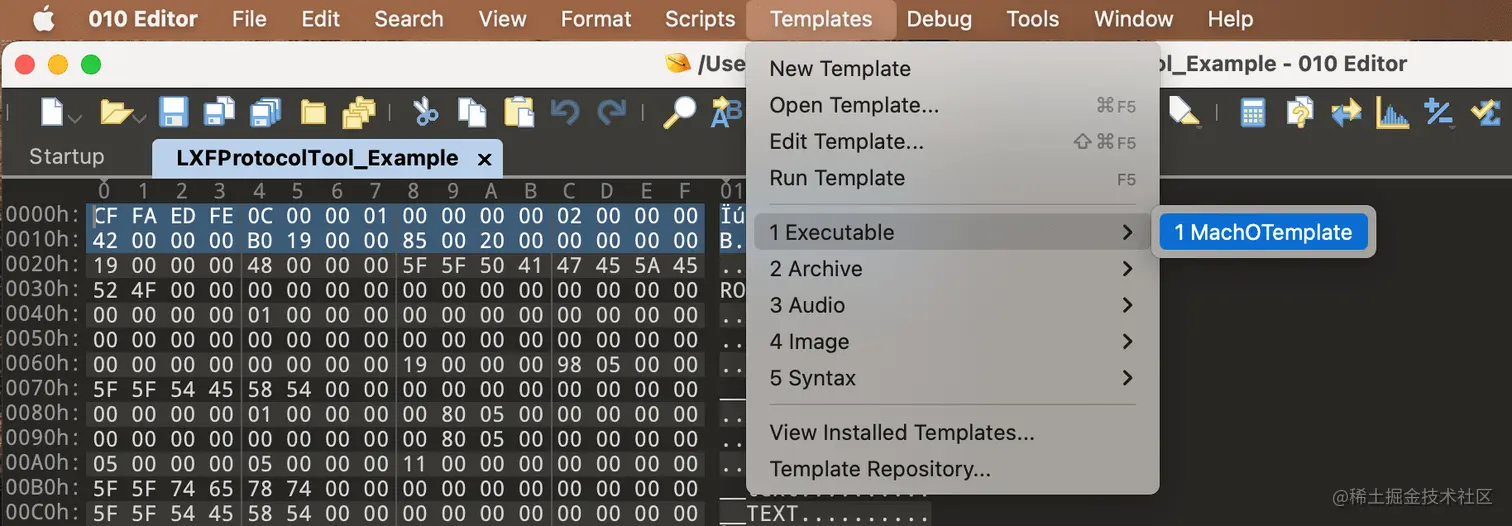回到程序,将 Mach-O 插入到 010 Editor中,接着在 Templates 菜单中选择刚才点击的模板