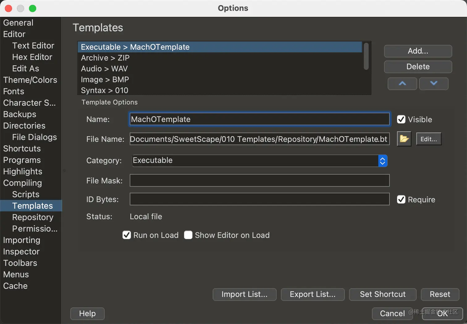 点击 Add 按钮,选择下载好的 MachOTemplate.bt,可以配置 Name 和 Category 等,然后点击 OK