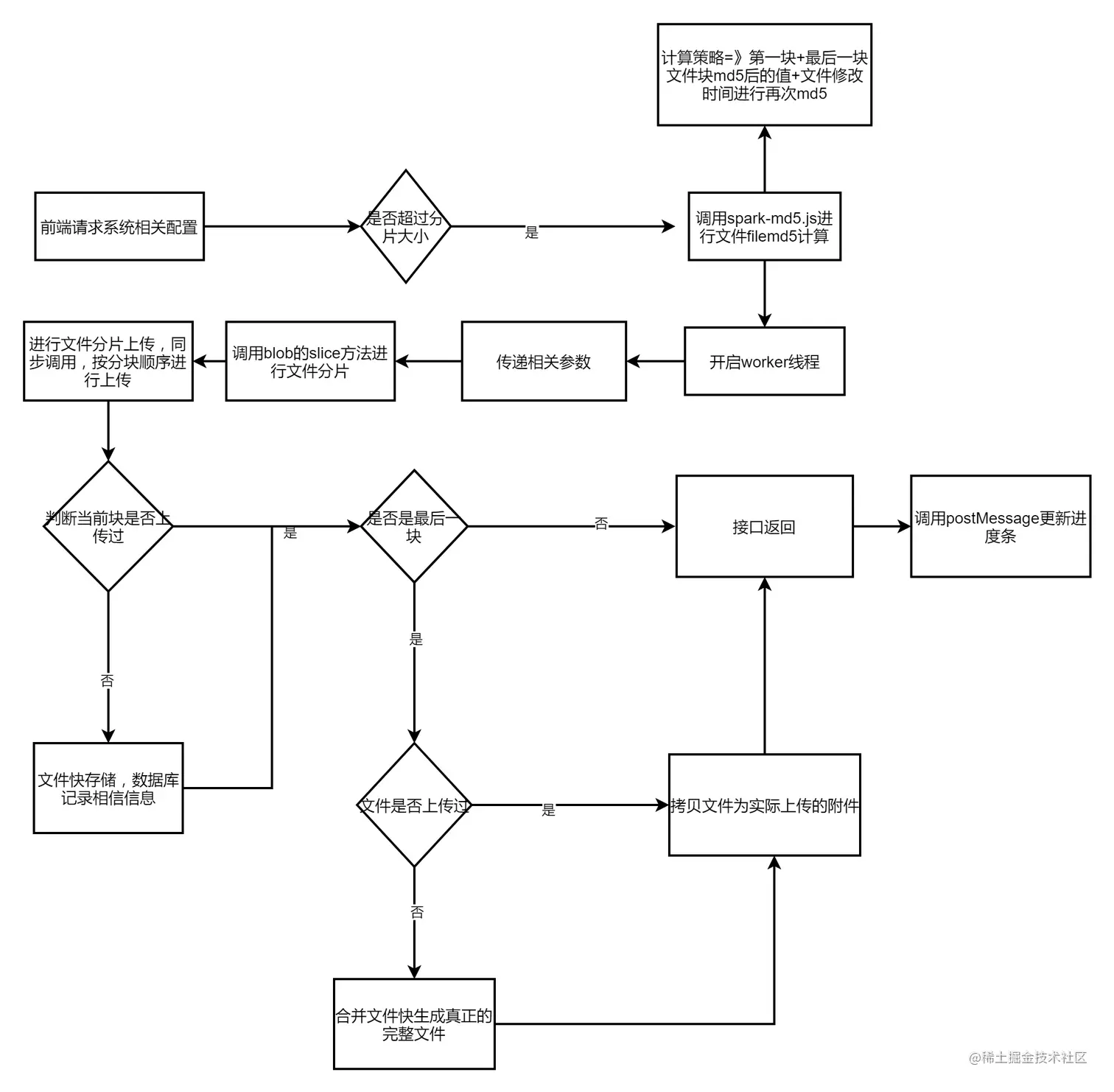 最近好几个项目在运行过程中客户都提出文件上传大小的限制能否设置的大一些,用户经常需要上传好几个G的资料文件,如图纸,视频等,并且需要在上传大文件过程中进行优化实时展现进度条,进行技术评估后针对框架文件上传进行扩展升级,扩展接口支持大文件分片上传处理,减少服务器瞬时的内存压力,同一个文件上传失败后可以从成功上传分片位置进行断点续传,文件上传成功后再次上传无需等待达到秒传的效果,优化用户交互体验,具体的实现流程如下图所示