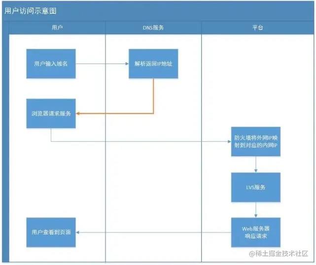 一般用户的请求,会先从域名开始,经过DNS服务器解析后拿到外网IP地址,经过外网IP访问防火墙和负载之后打到服务器,最后服务器响应后将结果返回到浏览器。