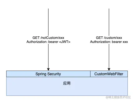 如果能让请求先到达我们自定义的 Filter,请求路径以 /custom/ 开头的,处理完自定义 token 校验等逻辑,然后将 Authorization Header 去掉(在 OAuth2AuthenticationProcessingFilter.doFilter 中,如果取不到 Bearer Token,不会抛异常),其它请求直接放行,也是一个可以达成目标的思路。