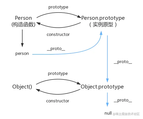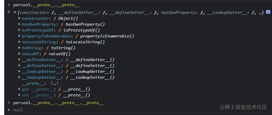 这么一对比,看的更清晰一些,Object 的原型对象就是 null。找到 null 就不用再往上找了,因为 null 是空,啥也没有,原型也是没有的。