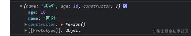 Person 函数内部会有个 prototype 属性,这个属性是一个对象,也就是我们说的原型对象,我现在给它里边添加了两个属性 name 和 age。