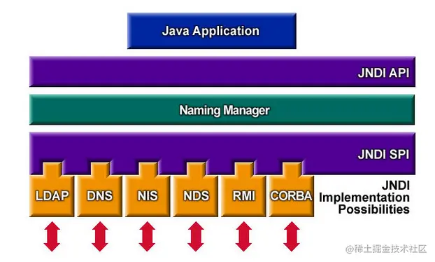 JNDI 架构上主要包含两个部分,即 Java 的应用层接口和 SPI,SPI 全称为 Service Provider Interface,即服务供应接口,主要作用是为底层的具体目录服务提供统一接口,从而实现目录服务的可插拔式安装,如下图所示: