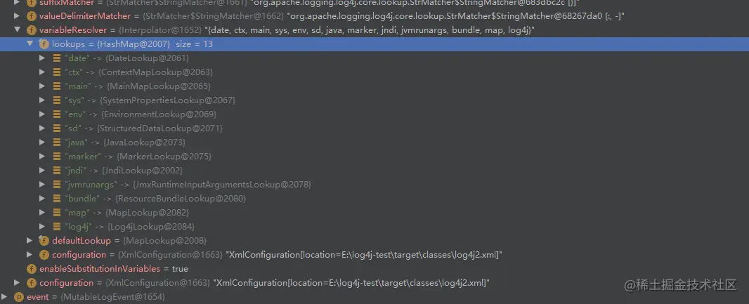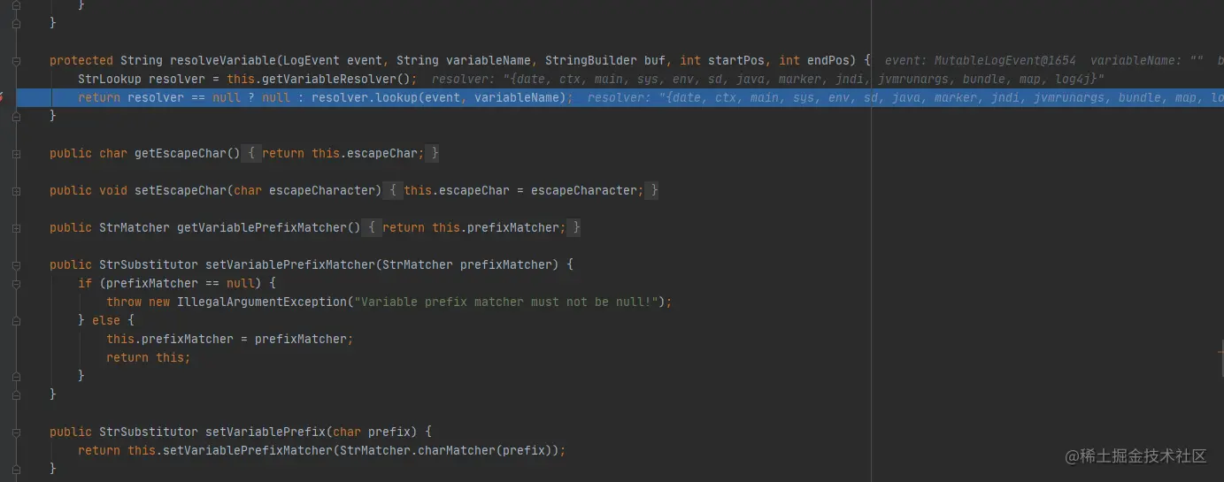 然后一路跟下去,resolveVariable方法这里则直接根据不同的协议选择相应的lookup逻辑进行解析执行,通过log4j-core 自带的JndiLookup进行处理JNDI URL, getVariableResolver()获取支持的协议{date, ctx, main, sys, env, sd, java, marker, jndi, jvmrunargs, bundle, map, log4j},不同的版本支持的协议略有不同,比如2.14.1支持的是{date, java, marker, ctx, lower, upper, jndi, main, jvmrunargs, sys, env, log4j},所以2.15.0 rc1一些waf绕过也不是通用的。