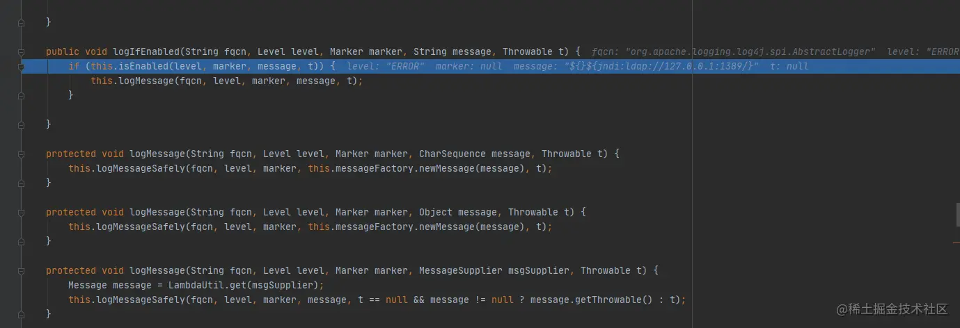 到达isEnabled,这里有个限制就是log 的level等级必须大于或等于配置的level,在测试的几个版本中,不配置的情况下默认为ERROR,所以info之类的很多无法触发漏洞,log4j2中, 共有8个级别,从低到高为:ALL < TRACE < DEBUG < INFO < WARN < ERROR < FATAL < OFF。