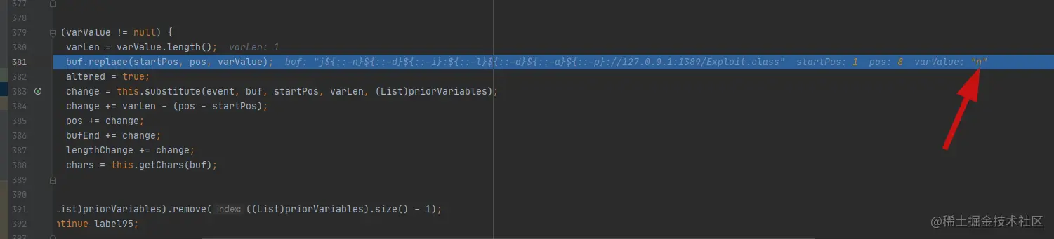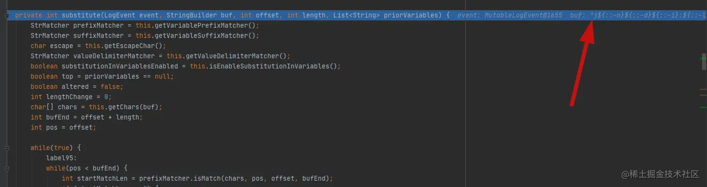 当匹配到":-"会进行下面的处理,会把匹配${}转化为字符数组,然后对这个数组进行遍历,遇到":-"就会使用substring函数把":-"之前的内容包括给":-"截掉,这里":-"不分先后,例如"-:",因为是作为一个数组匹配的,只要在一起就行。所以便有了千奇百怪的绕waf手法。