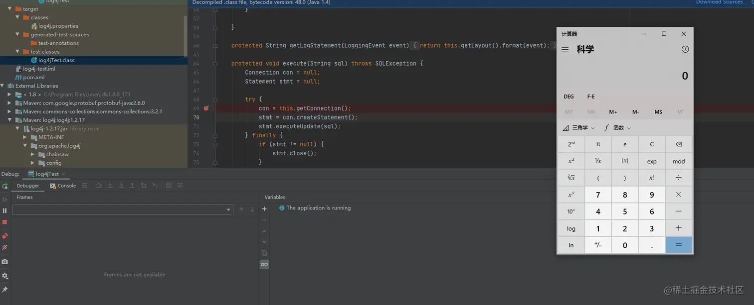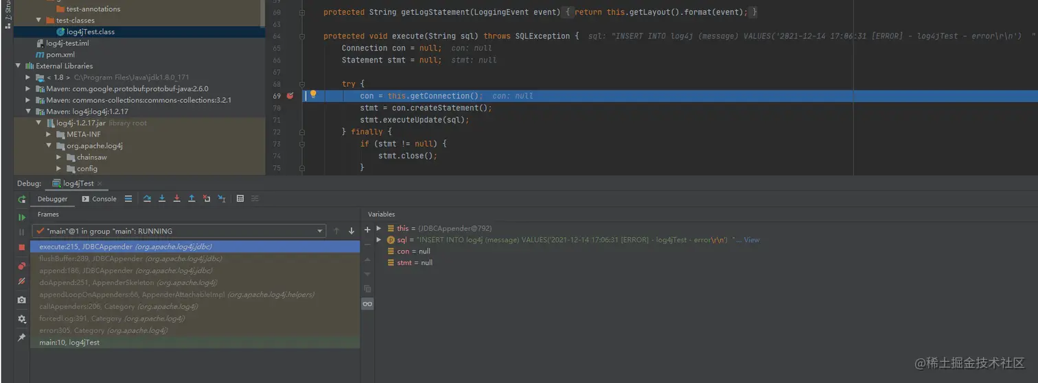 我们直接把断点打在JDBCAppender.java的getConnection()处,因为这也是MYSQL JDBC反序列化的执行点。