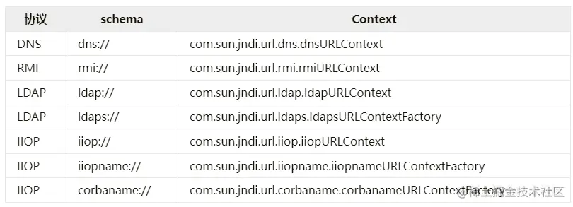 JDK 中默认支持的 JNDI 自动协议转换以及对应的工厂类如下所示: