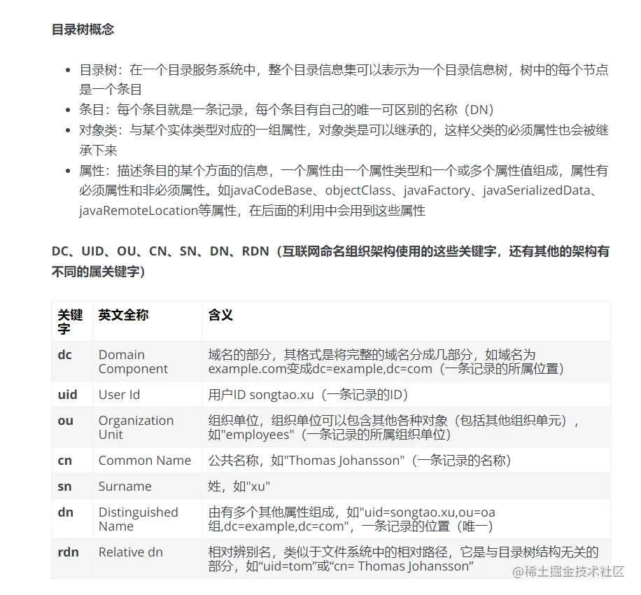 LDAP 的目录信息是以树形结构进行存储的,在树根一般定义国家(c=CN)或者域名(dc=com),其次往往定义一个或多个组织(organization,o)或组织单元(organization unit,ou)。一个组织单元可以包含员工、设备信息(计算机/打印机等)相关信息。