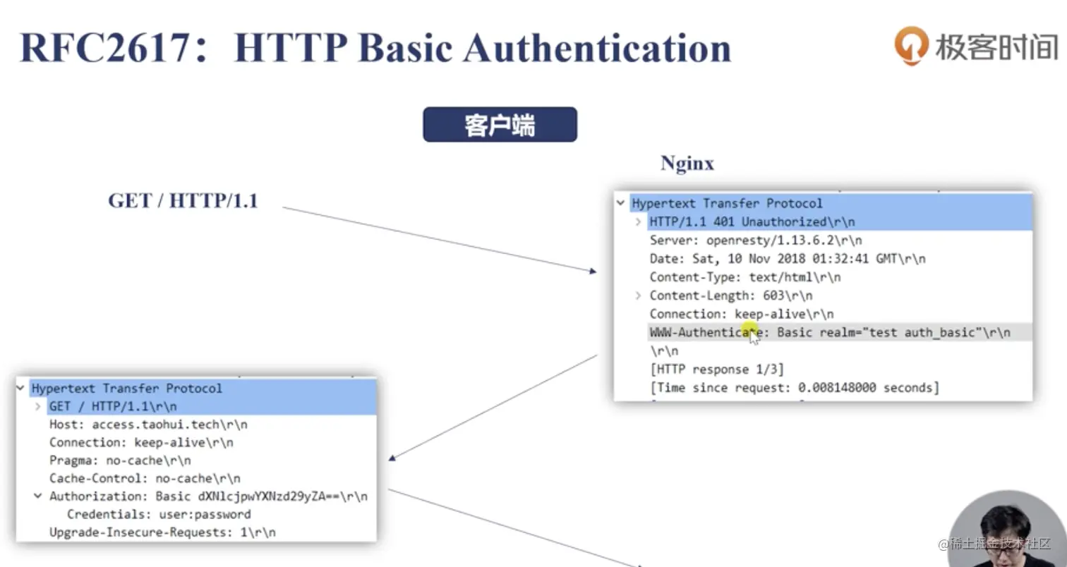 客户端访问nginx时,nginx会返回一个401响应,并且响应体中有一个WWW-Authenticate字段,浏览器在接收到该响应之后,就会弹出一个要求输入账号密码的弹出框,输入提交之后,浏览器就会讲我们输入的账号密码存在Credentials字段中,以明文的方式发送给nginx,所以这里传输数据很不安全,使用HTTPS加密之后就安全了。