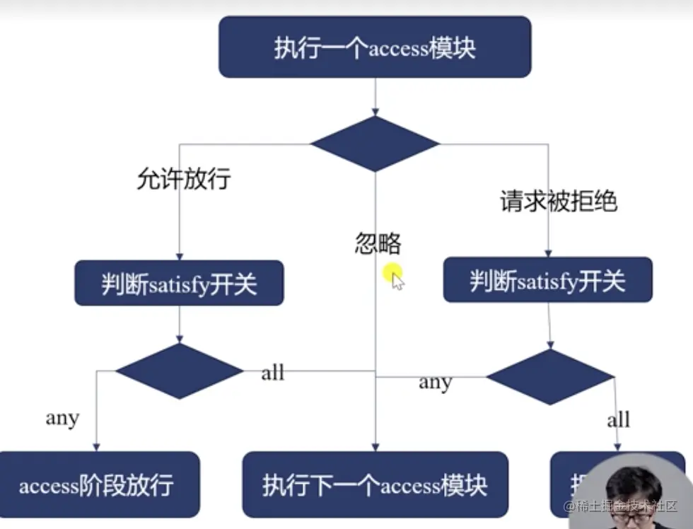 当请求放行之后,判断satisfy指令的值,如果为any,则access阶段的任何一个模块通过,就向下执行下一个阶段。如果为all,则需要access阶段的所有模块都通过,才会向下执行下一个阶段。
