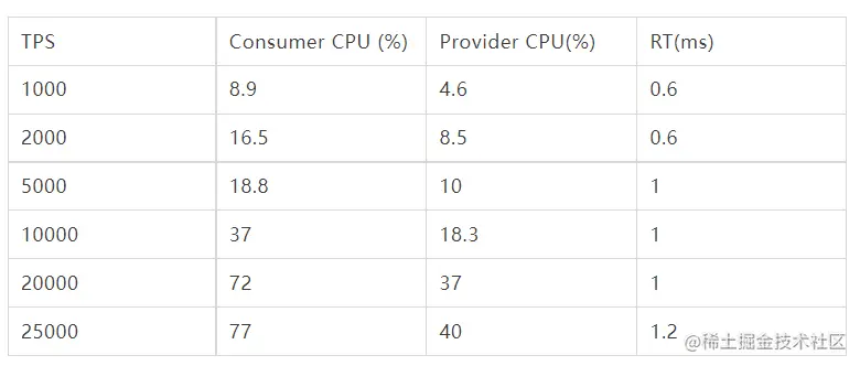 我们使用了 3 台相同规格机器,一台作为Server(运行一个 triple-server),一台作为Client(运行一个triple-server 和triple client) ,一台作为施压机向 Client 发起针对整个链路的调用施压,并进行数据记录,记录rt、真实 tps 以及client 和 server 的 CPU 占比数据。