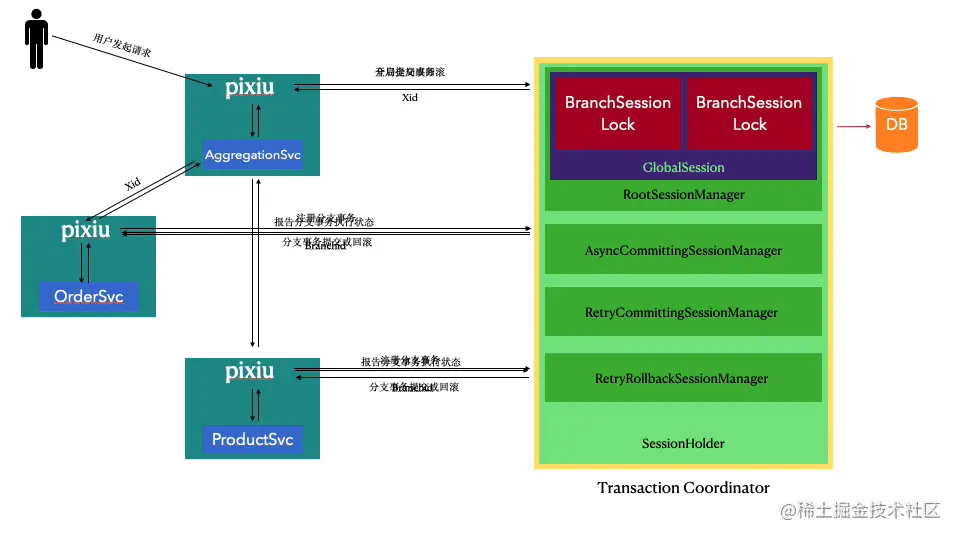 两个社区现已合作将 TCC 模式 seata-golang 集成到了 dubbo-go-pixiu 中,只需要简单的配置、就能集成 TCC 模式协调分布式事务的方案,整体流程原理见上图。为了进一步降低大家使用分布式事务的门槛,seata-golang 社区也在考虑将 AT 模式做到 DB 代理层,届时在 dubbo-go-pixiu 中使用 seata-golang 会更加方便,敬请期待。