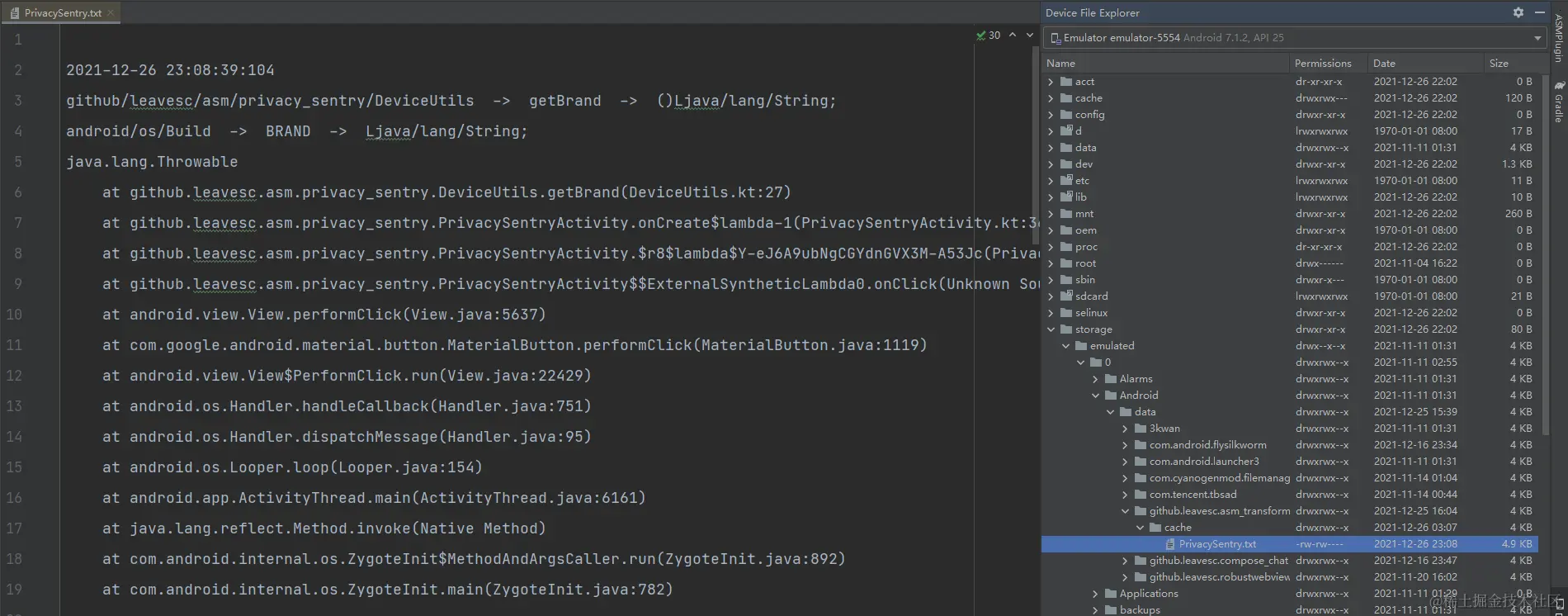 最终,每当 DeviceUtils 中的两个方法被执行时,在 externalCacheDir目录下就会自动生成一个 PrivacySentry.txt 文件,当中就记录了隐私方法的具体调用时间和调用链。根据该调用链,我们就可以快速定位是哪一块业务执行了敏感操作