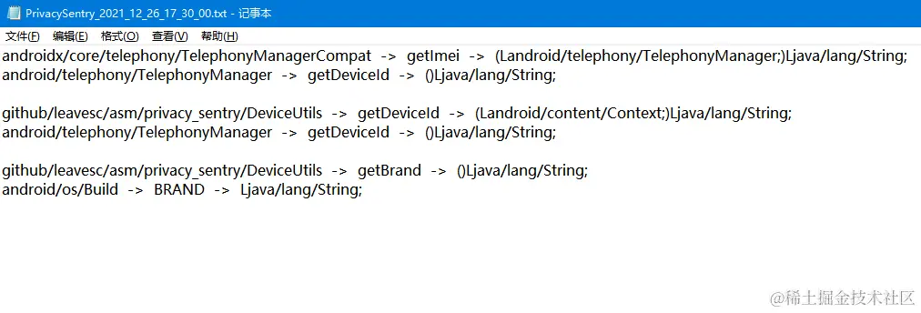 当 Transform 结束后,就会在桌面上生成一个文本文件了,当中就记录了 DeviceUtils 中的两个隐私操作行为。此外,由于项目中我同时引入了 androidx.core:core:1.7.0,所以也会把 TelephonyManagerCompat 给扫描出来,可以看到该类当中包含的 String getImei(TelephonyManager) 方法也会去获取 Device ID