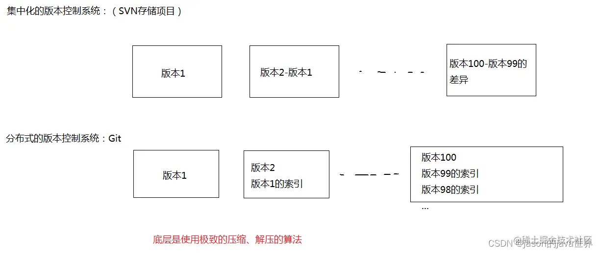 分布式的版本控制系统在管理项目时存放的不是项目版本与版本之间的差异.它存的是索引(所需磁盘空间很少所以每个客户端都可以放下整个项目的历史记录)