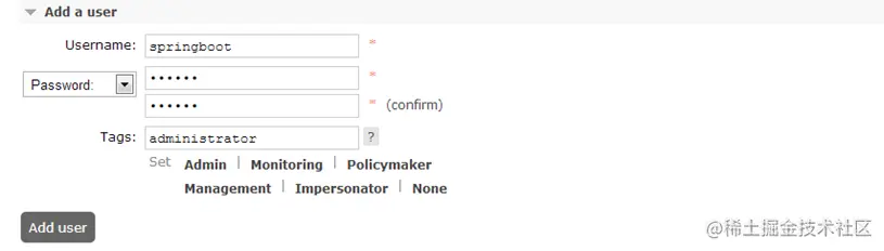 新增管理用户并设置权限 username:springboot password:123456