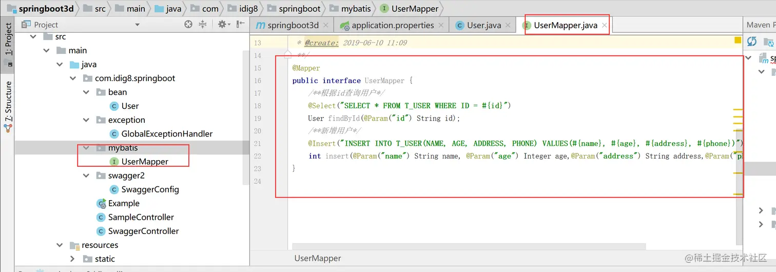 5.创建UserMapper.java接口文件 包名为:com.idig8.springboot.mybatis