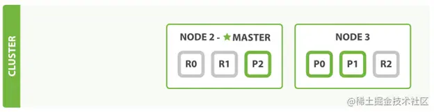 同时node1中有两个primary的shards,分别是P1和P2。Primary shard是非常重要的,必须要存在,否则相应的index就不能工作。所以我们需要在Node2和node3上中重新assign相应的primary shard。这里我们把node2中的shard2变成primary,把node3中的shard1变成primary,所以node1出问题之后整个cluster中的节点就变成了如下图所示的样子。