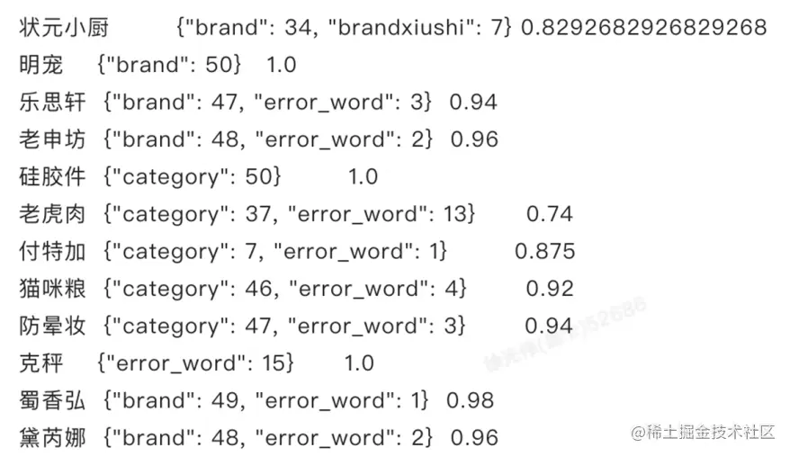 - 下面右边的这个例子是“汉本萃葆蔚饮品”。这里开放搜索的电商模型完全没有识别出其中特有的品牌和它的子系列,客户在我们提供的行业模型基础上如果去做自主的定制优化一样会遇到上面介绍行业模型解决方案时的那些问题,从而最终很难去突破85分,