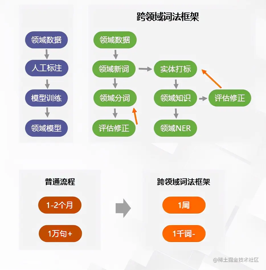 下面的模型图是NER的流程,我们采用了结合图神经网络的graph NER的模型结构,它可以融合知识库和标注数据。 知识库是由刚才分词的链路中新词发现模块自动挖掘出的新词,然后我们做一个自动的实体词打标,从而去构建出领域的知识库。对应的技术论文我们都已经发表在NLP 领域顶会ACL上。