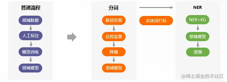同样是以分词和NER为例,下面模型图是分词的流程。我们首先通过自动的新词发现算法去挖掘目标领域的领域新词,得到这些新词之后,我们会在目标领域上去构建一个远程监督的训练数据。