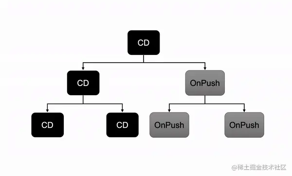 刚才我们说了每次触发变化检测,都会从根组件开始,沿着整棵组件树从上到下的执行每个组件的变更检测,默认情况下,直到最后一个叶子 Component 组件完成变更检测达到稳定状态。在这个过程中,一但父组件完成变更检测以后,在下一次事件触发变更检测之前,它的子孙组件都不允许去更改父组件的变化检测相关属性状态的,这就是单向数据流。