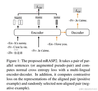 而对比损失Lctr为了拉近语义空间中跨语言同义词的表征距离,并且拉远非同义词表征的距离。具体为:以某个样本点的源端向量表示为锚点,以该样本目标端的向量表征为正样本(过encoder),以同一个batch中其他样本点的目标端句子向量表示为负样本,最小化锚点和正样本的距离,最大化锚点和所以负样本的距离。